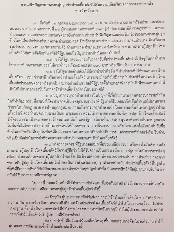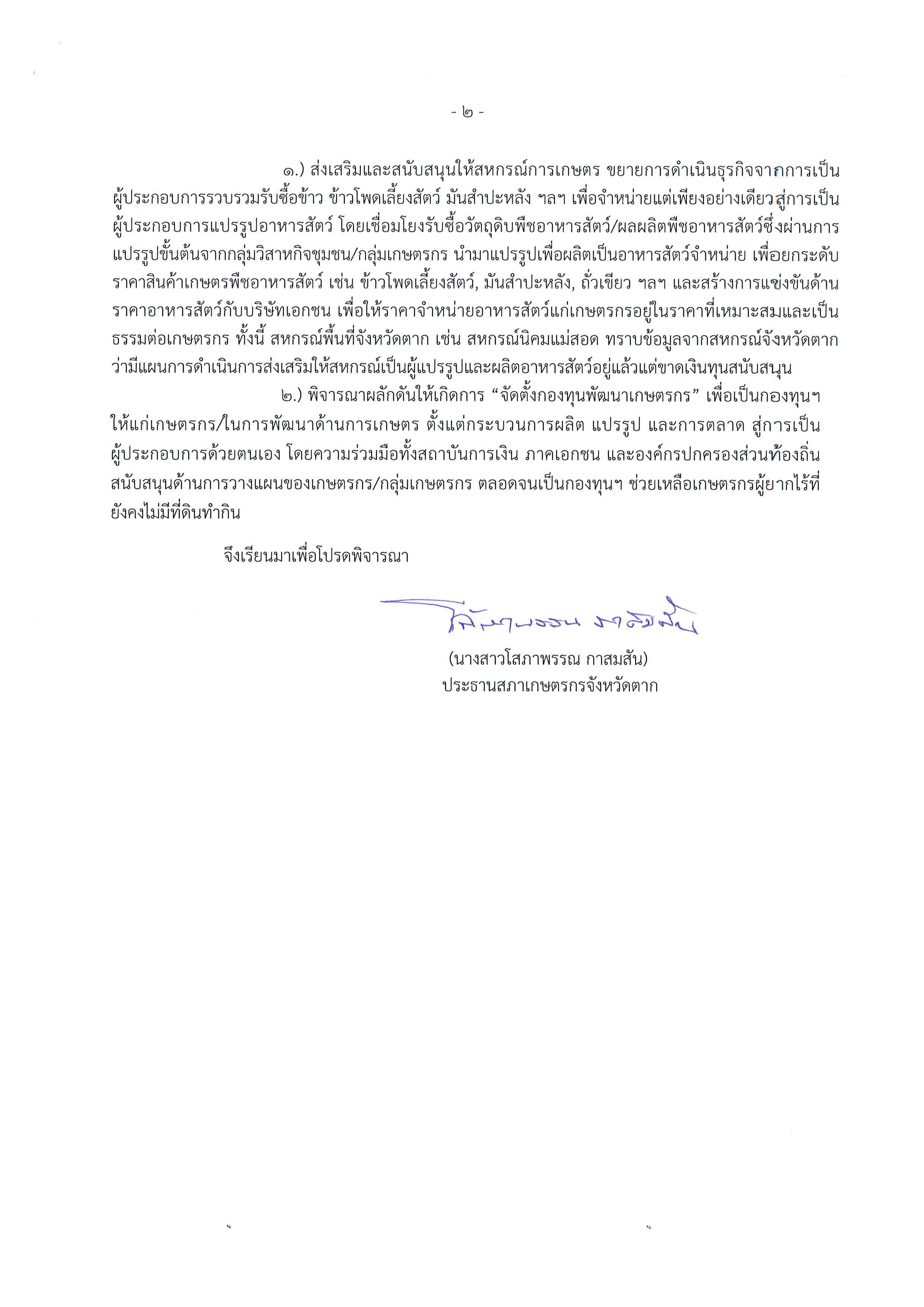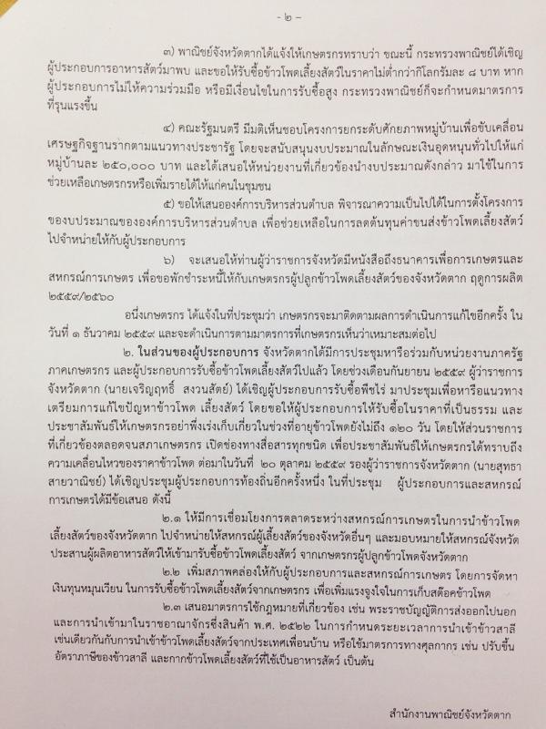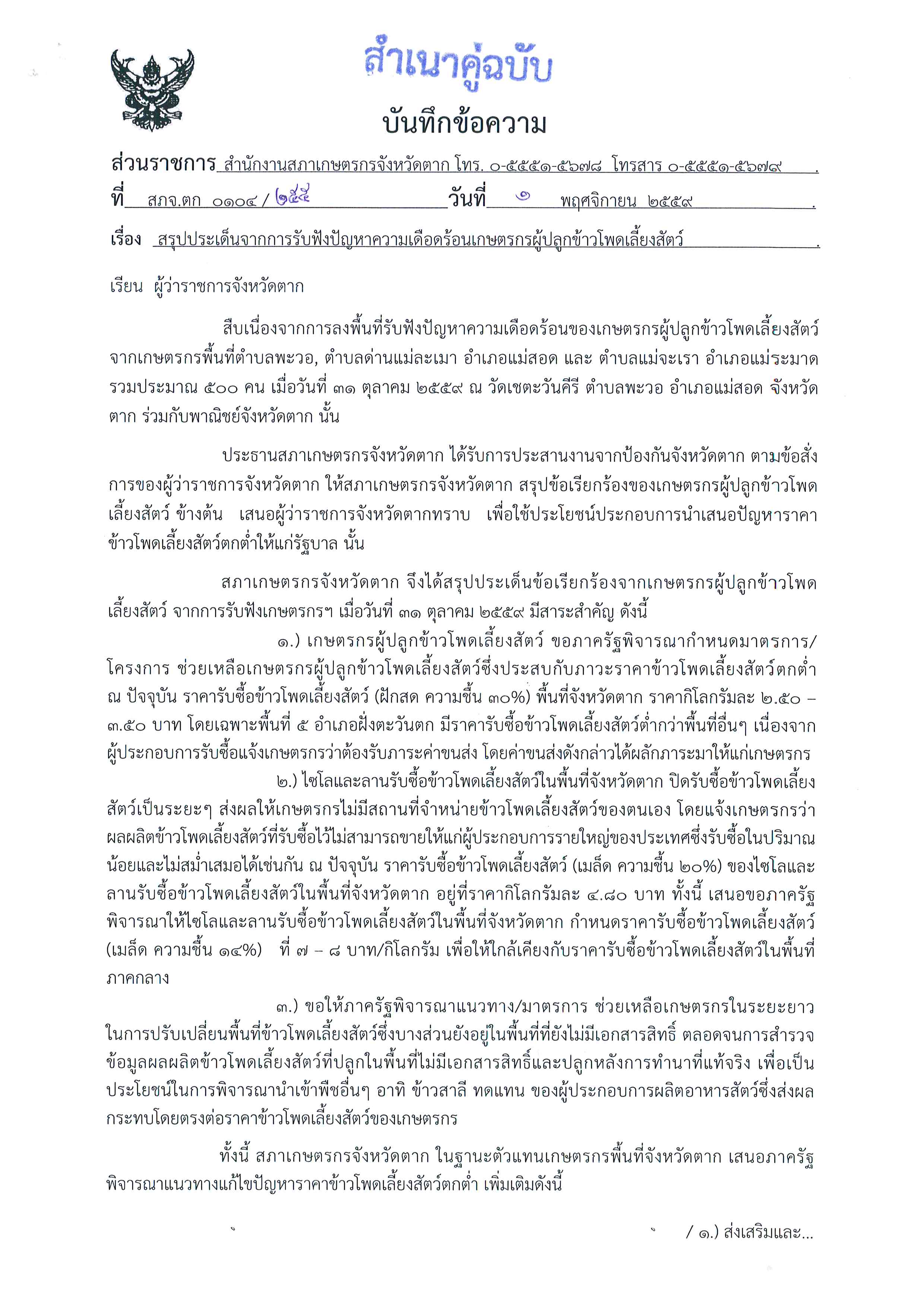 ทั้งนี้ สภาเกษตรกรจังหวัดตาก ได้สรุปประเด็นปัญหานำเรียนผู้ว่าราชการจังหวัดตากทราบ เพื่อเสนอภาครัฐพิจารณาแนวทางแก้ไขปัญหาดังกล่าวต่อไป