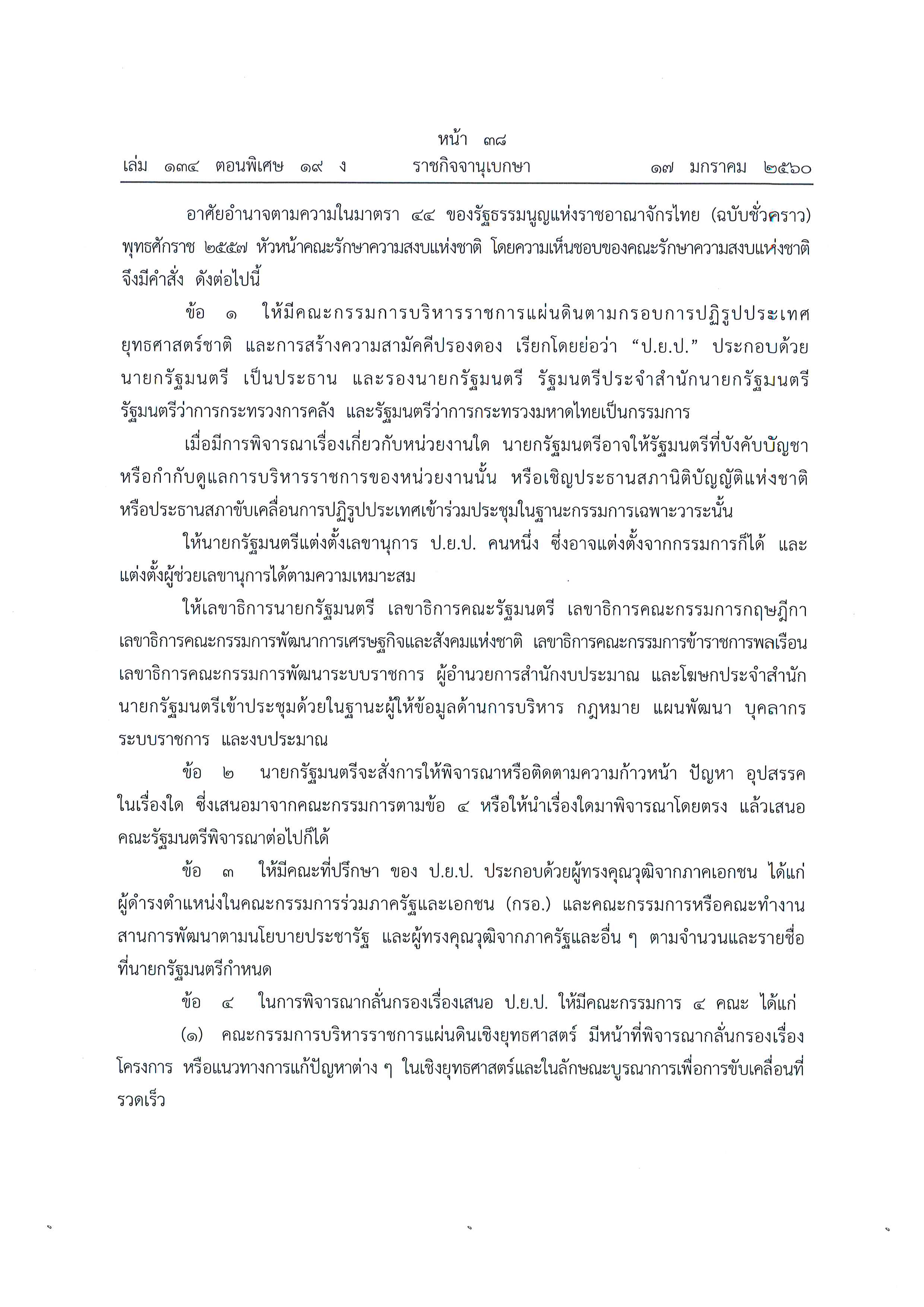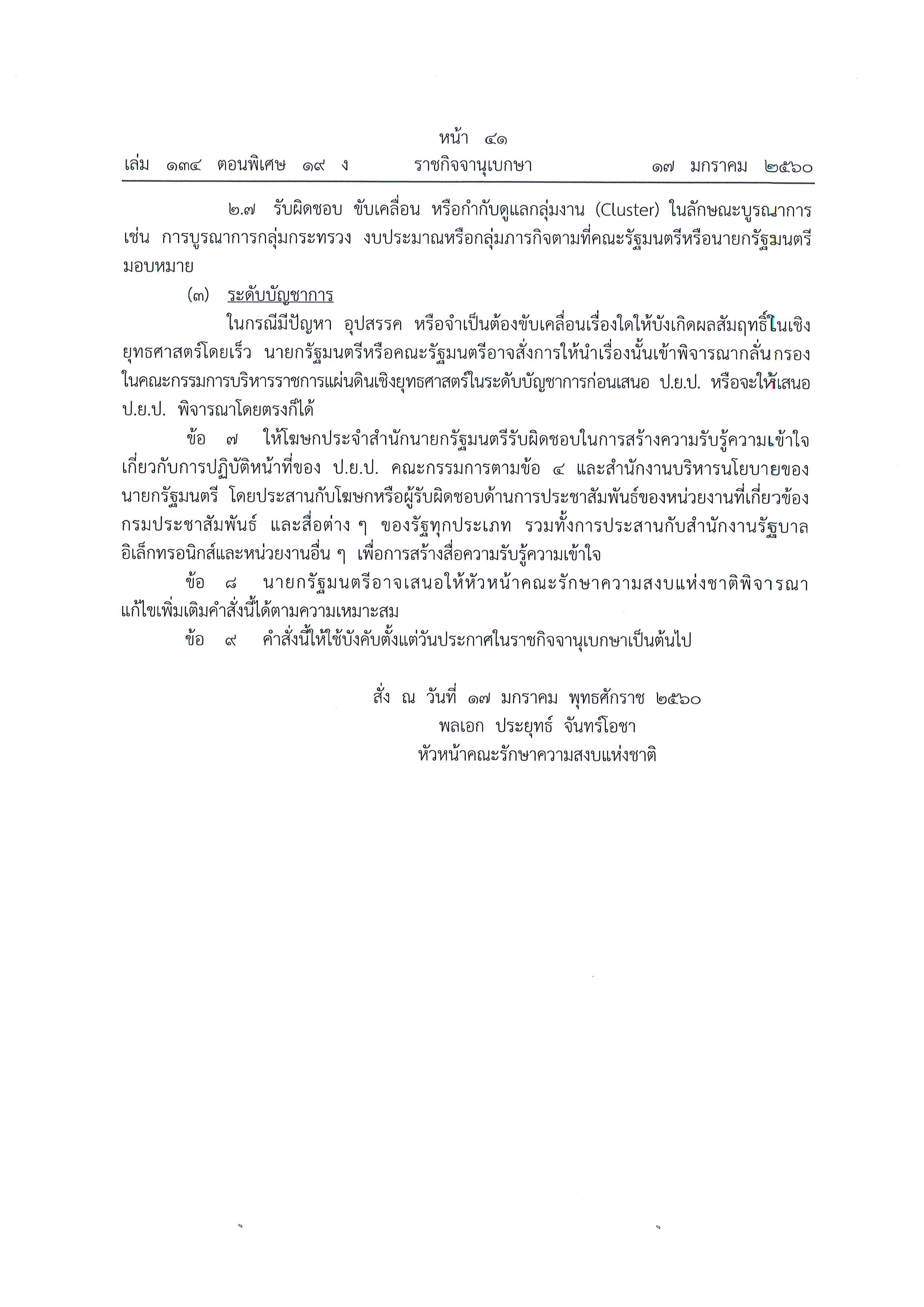 คำสั่งหัวหน้าคณะรักษาความสงบแห่งชาติ ที่ 3/2560 เรื่อง การขับเคลื่อนการปฏิรูปประเทศ ยุทธศาสตร์ชาติ และการสร้างความสามัคคีปรองดอง ลงวันที่ 17 มกราคม 2560