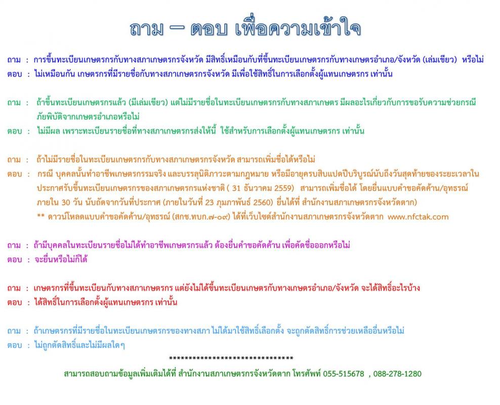 หากมีข้อสงสัยสามารถสอบถามเพิ่มเติมได้ที่ สำนักงานสภาเกษตรกรจังหวัดตาก 055-515678 / 088-278-1280
