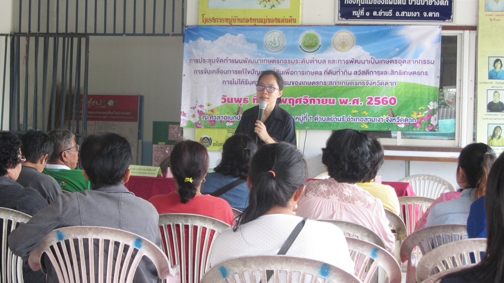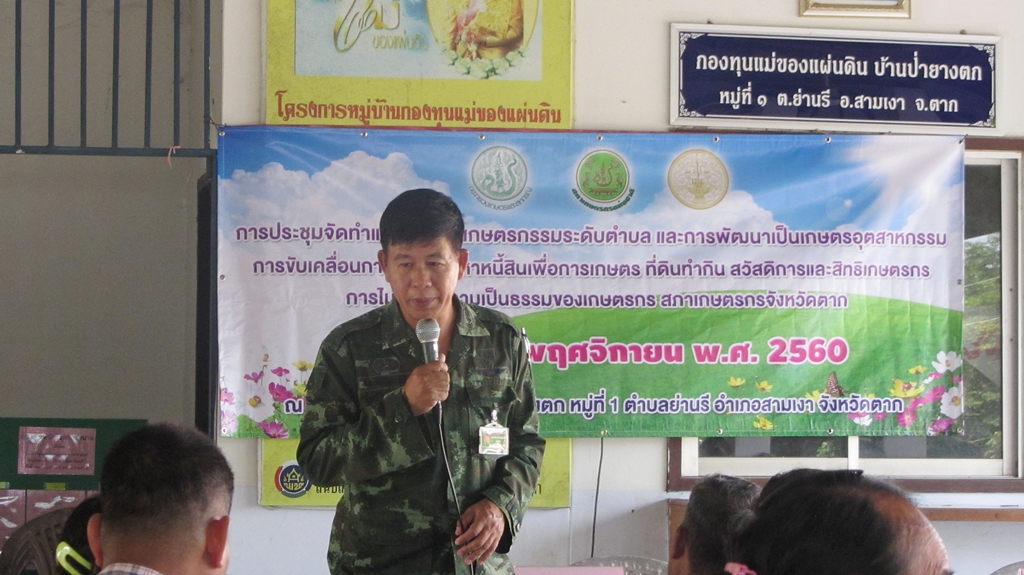 การขับเคลื่อนการแก้ไขปัญหาหนี้สินเพื่อการเกษตร ที่ดินทำกิน สวัสดิการและสิทธิเกษตรกร การไม่ได้รับความเป็นธรรมของเกษตรกร สภาเกษตรกรจังหวัดตาก ในพื้นที่ ตำบลย่านรี อำเภอสามเงา เมื่อวันที่ 15 พฤศจิกายน 2560 ณ ศาลาอเนกประสงค์บ้านป่ายางตก หมู่ที่ 1 ตำบลย่านรี อำเภอสามเงา จังหวัดตาก โดยนางสาวกนกวรรณ ตันติคะเนดี หัวหน้าสำนักงานสภาเกษตรกรจังหวัดตาก, นายศุภพร พรมมิน หัวหน้าส่วนขับเคลื่อนฯ และพนักงานฯ สำนักงานสภาเกษตรกรจังหวัดตาก เพื่อรวบรวมปัญหาและข้อเสนอจากเกษตรกรในพื้นที่ เพื่อจัดทำแผนพัฒนาเกษตรกรรมระดับตำบล มีผู้เข้าร่วมการประชุมฯ รวมทั้งสิ้น 57 คน ในการนี้มีเจ้าหน้าที่จากหน่วยงานที่เกี่ยวข้องร่วมให้ความรู้ คำแนะนำ ข้อมูลข่าวสารมาตรการ/โครงการ ความช่วยเหลือของภาครัฐแก่เกษตรกร ดังนี้