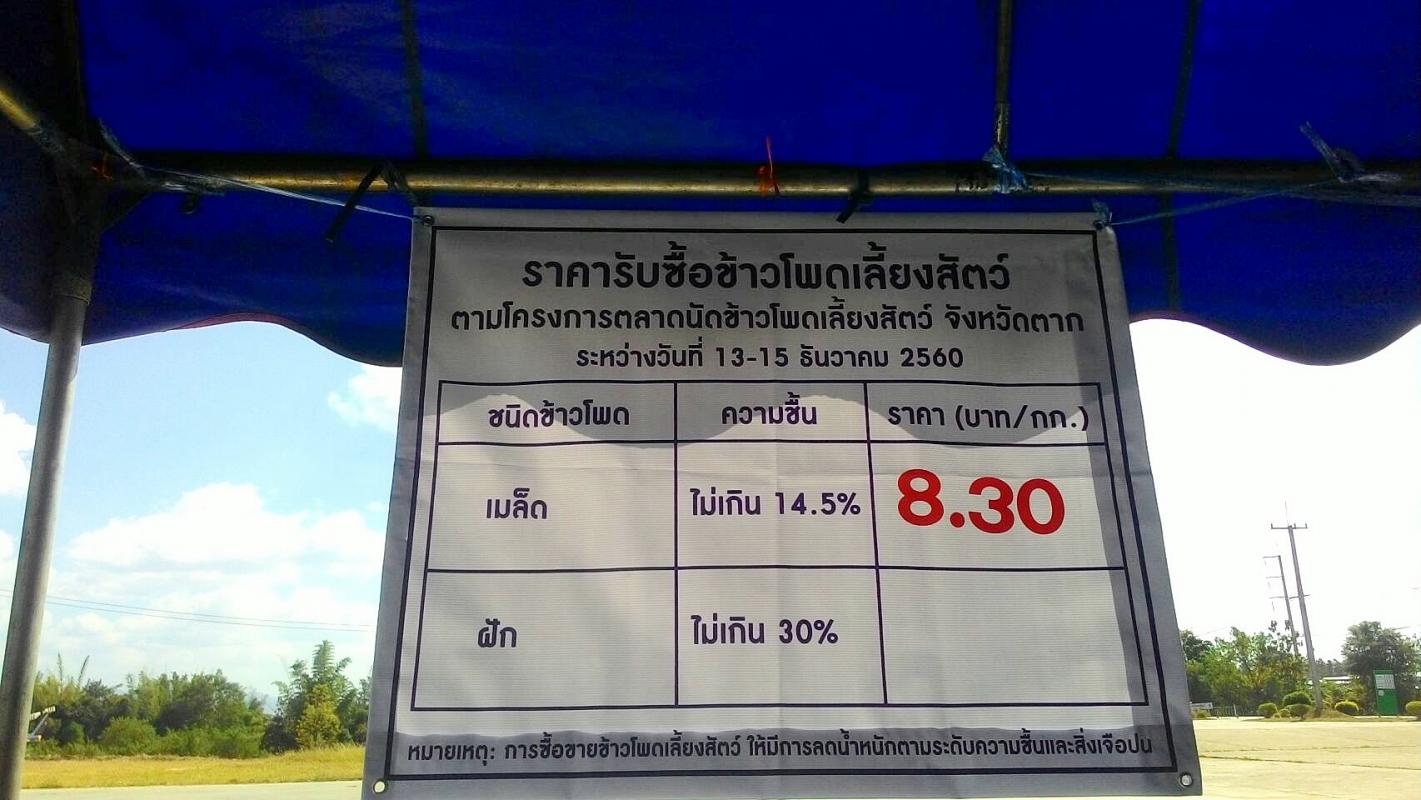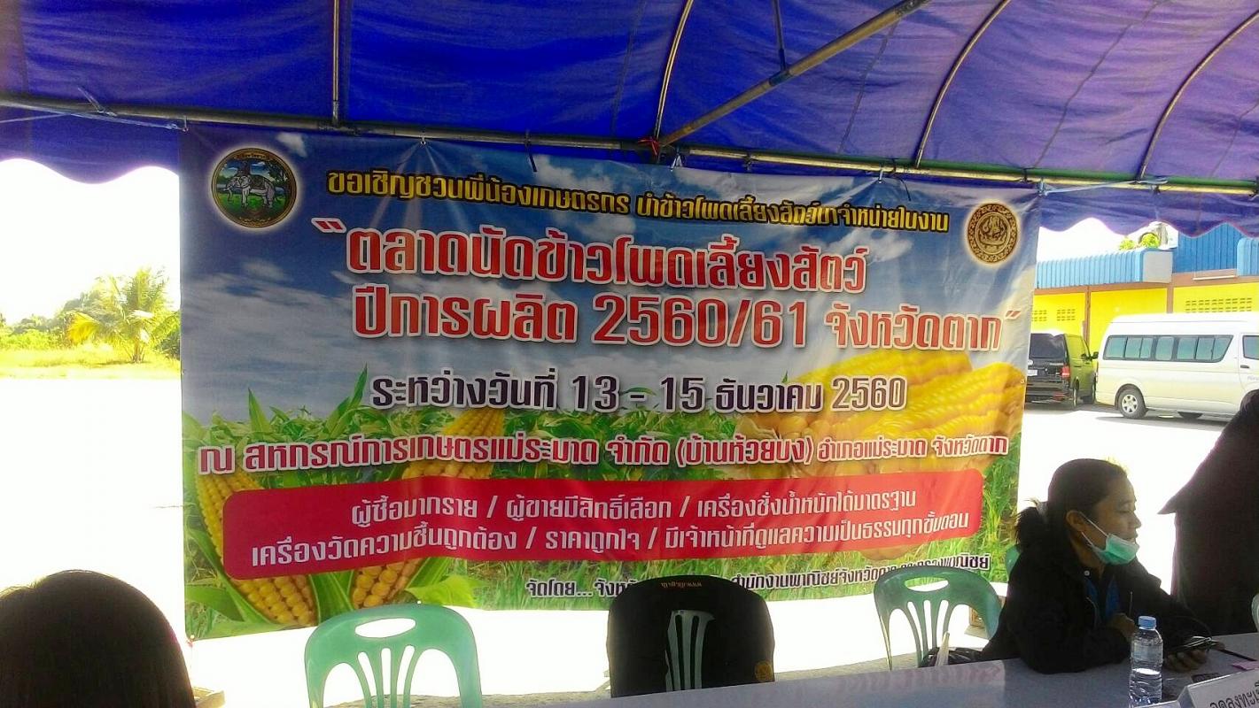 สภาเกษตรกรจังหวัดตากในฐานะตัวแทนเกษตรกรพื้นที่จังหวัดตาก ขอขอบพระคุณ ท่านผู้ว่าราชการจังหวัดตาก สำนักงานพาณิชย์จังหวัดตาก ที่กรุณาผลักดันให้เกิด "โครงการตลาดนัดข้าวโพดเลี้ยงสัตว์ ปีการผลิต 2560/61" ขึ้น ในพื้นที่จังหวัดตาก ตามข้อเสนอของสภาเกษตรกรจังหวัดตาก ที่มีวัตถุประสงค์ เพื่อยกระดับราคาข้าวโพดเลี้ยงสัตว์ เชื่อมโยงผู้ประกอบการรับซื้อทั้งในและนอกพื้นที่จังหวัดตาก เพิ่มศักยภาพการแข่งขันด้านราคารับซื้อข้าวโพดเลี้ยงสัตว์ ตลอดจนเกษตรกรได้รับชำระเงินค่าข้าวโพดเลี้ยงสัตว์ทันทีที่ขายผลผลิต ทั้งนี้ ตลาดนัดข้าวโพดเลี้ยงสัตว์ ดำเนินการระหว่างวันที่ 13 - 15 ธันวาคม 2560 ณ สหกรณ์การเกษตรแม่ระมาด อำเภอแม่ระมาด จังหวัดตาก