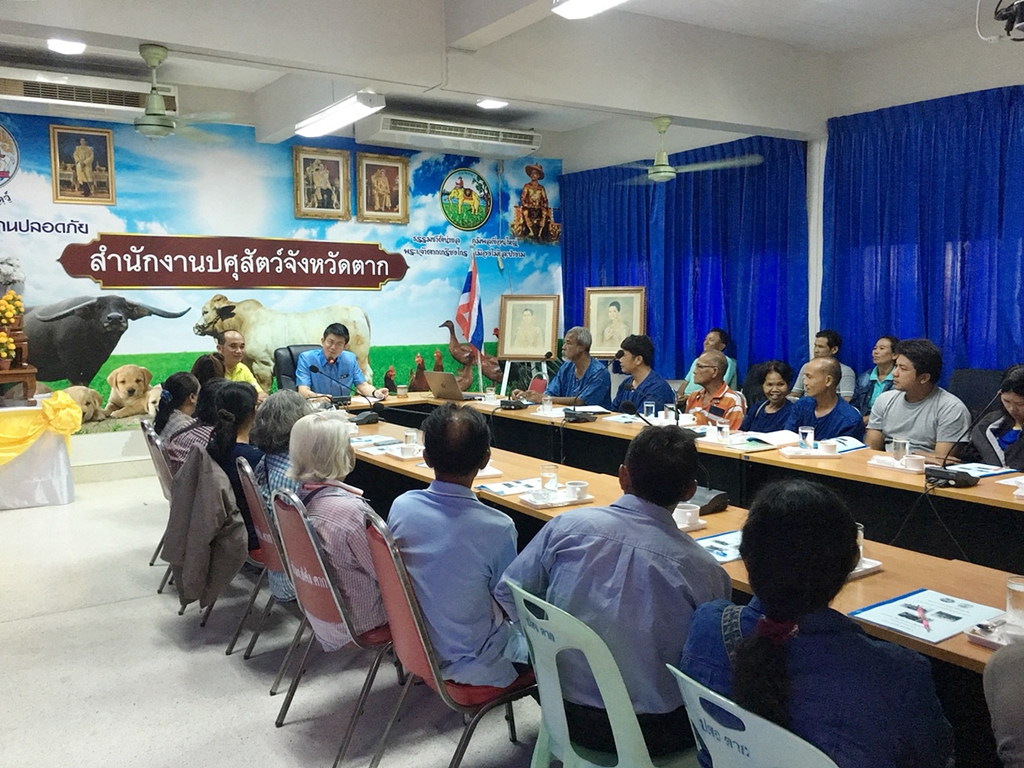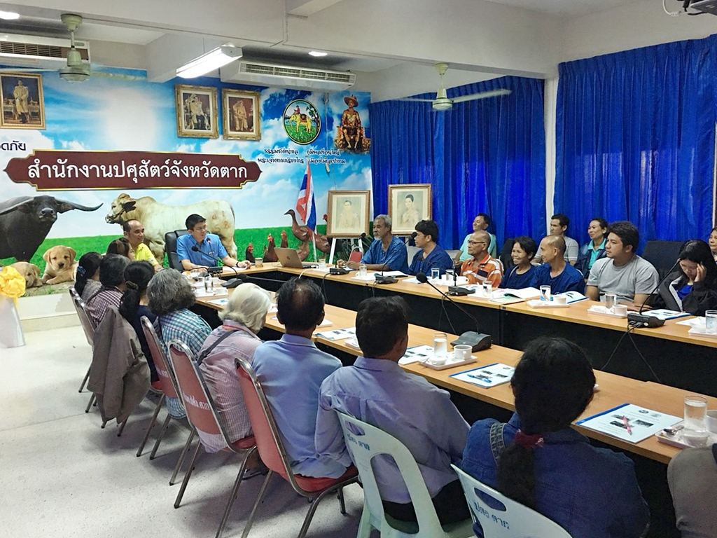 นายศุภกร พรมมิน หัวหน้าส่วนขับเคลื่อนและการมีส่วนร่วม พร้อมด้วยนายเกรียงไกร โทนสังข์อินทร์ นักวิชาการเกษตรปฏิบัติการ สำนักงานสภาเกษตรกรจังหวัดตาก ร่วมการฝึกอบรม กิจกรรมที่ 1 ปรับระบบการเลี้ยงไก่พื้นเมือง ตามโครงการส่งเสริมการเกษตรแบบบูรณาการ เพิ่มศักยภาพการแปรรูป นวัตกรรมสินค้าเกษตรและปศุสัตว์ในพื้นที่จังหวัดตาก ระหว่างปศุสัตว์จังหวัดตากและสภาเกษตรกรจังหวัดตาก ในการนี้ นายพนธ์สมิทธิ์ กลางนภา ปศุสัตว์ปทุมธานี รักษาราชการแทนปศุสัตว์จังหวัดตาก ให้เกียรติเป็นประธานกล่าวเปิดการฝึกอบรมฯ โดยมีเกษตรกรกลุ่มเป้าหมายที่ทางสภาเกษตรกรจังหวัดตากคัดเลือก เข้าร่วมการอบรมฯ ในวันนี้จำนวน 31 ราย (จากทั้งสิ้น 60 ราย) เมื่อวันที่ 10 พฤษภาคม 2561 เวลา 9.00 น. ณ ห้องประชุมสำนักงานปศุสัตว์จังหวัดตาก