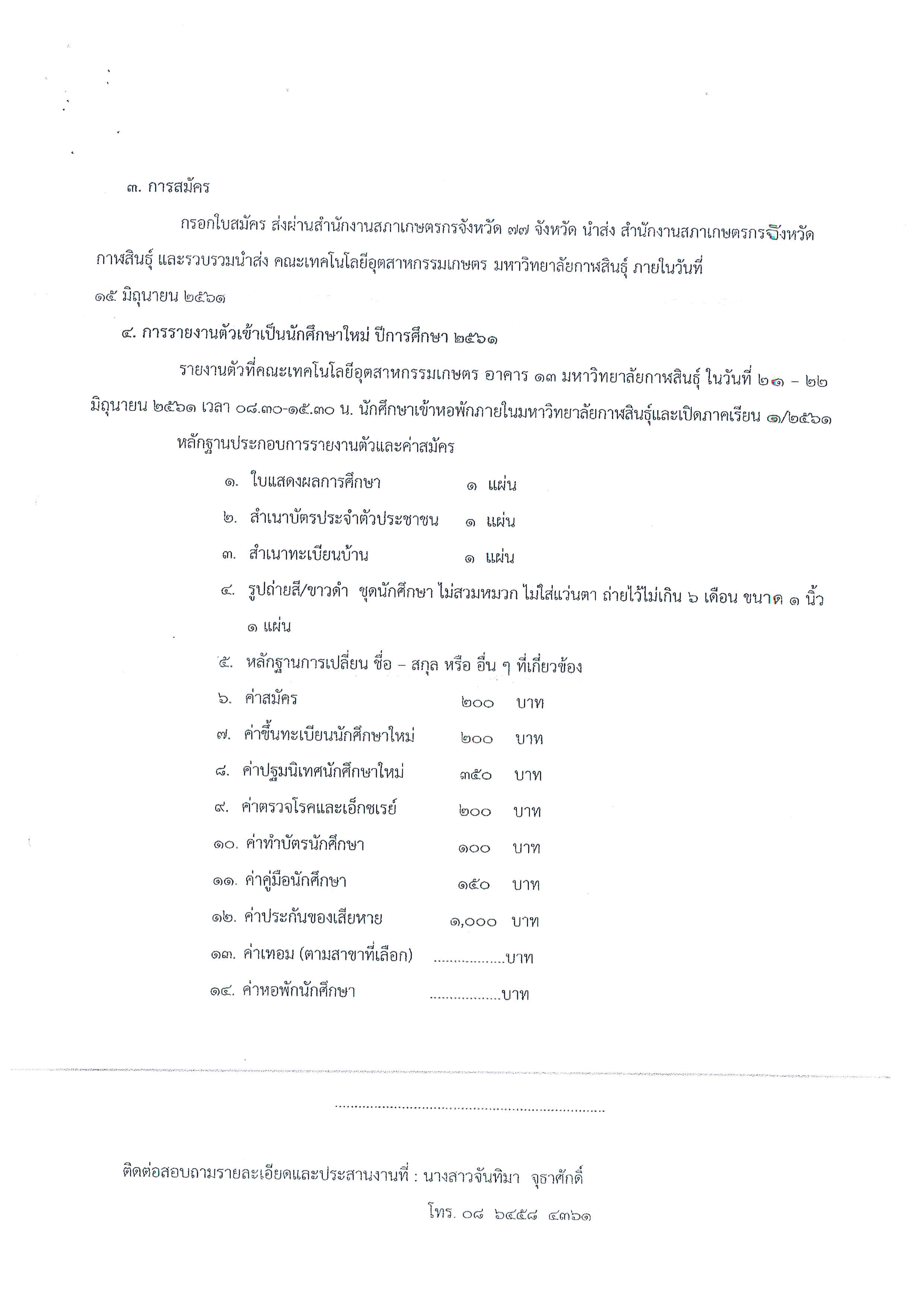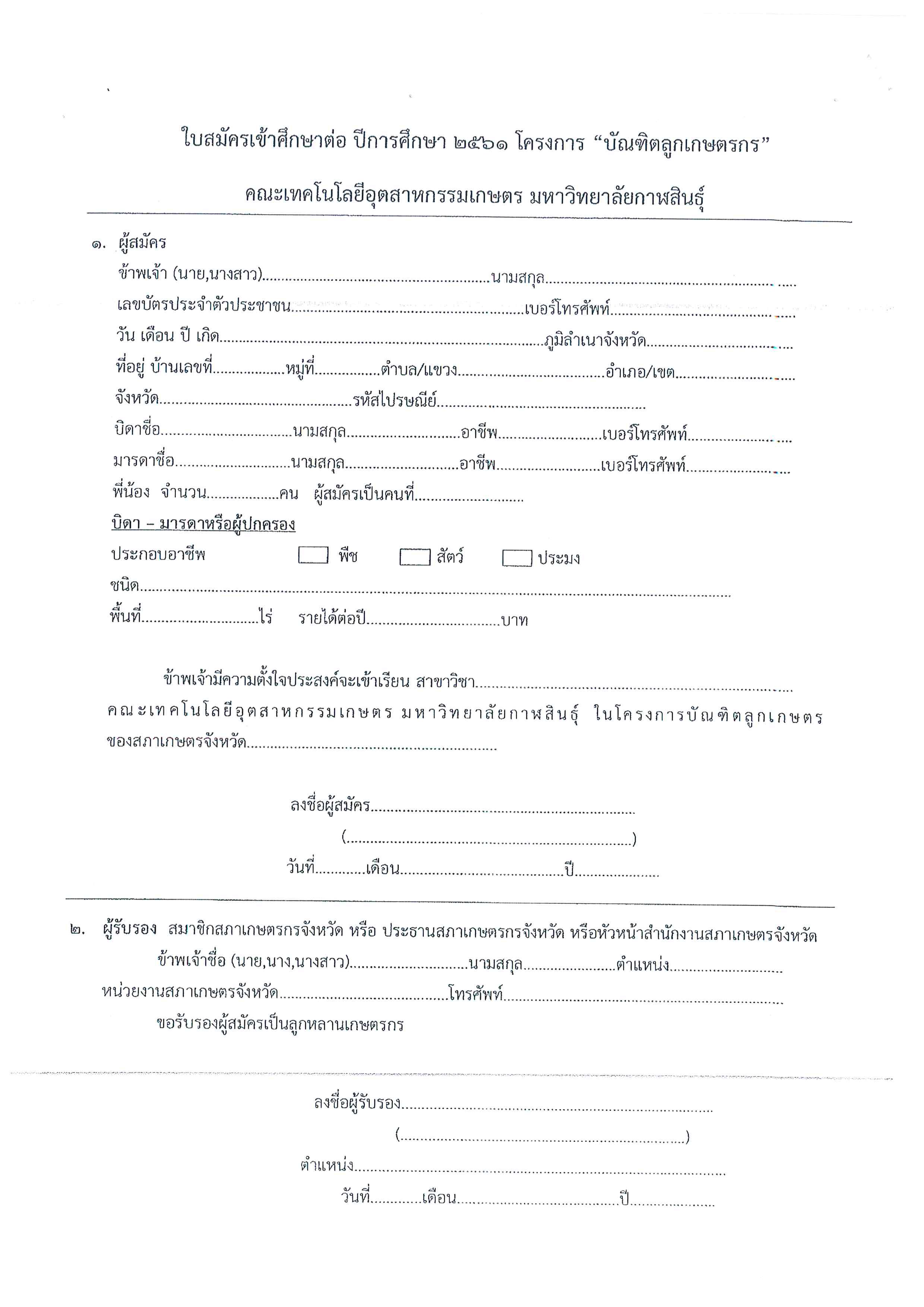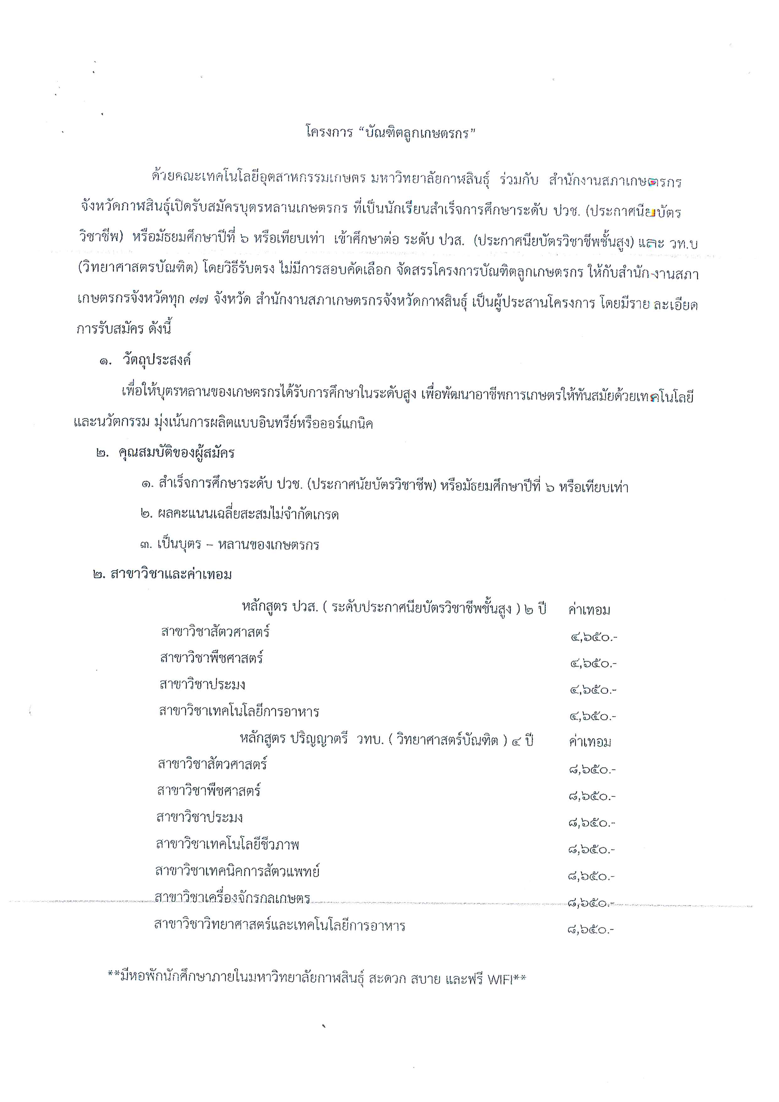 ด้วยสำนักงานสภาเกษตรกรจังหวัดกาฬสินธุ์ได้ประสานความร่วมมือทางวิชาการกับคณะเทคโนโลยีอุตสาหกรรมการเกษตร มหาวิทยาลัยกาฬสินธุ์ ดำเนินโครงการบัณฑิตลูกเกษตรกร เปิดรับสมัครบุตรหลานเกษตรกรที่สำเร็จการศึกษาระดับ ปวช. หรือ ม.6 หรือเทียบเท่า เข้าศึกษาต่อในระดับ ปวส. และ วท.บ. โดยวิธีรับตรง ไม่มีการสอบคัดเลือก ผู้ที่สนใจสามารถกรอกใบสมัคร ส่งผ่านสำนักงานสภาเกษตรกร 77 จังหวัด ภายในวันที่ 15 มิถุนายน 2561 ติดต่อขอรับใบสมัครหรือสอบถามข้อมูลเพิ่มเติมได้ที่ สำนักงานสภาเกษตรกรจังหวัดตาก โทร 055-515678, 088-278-1280