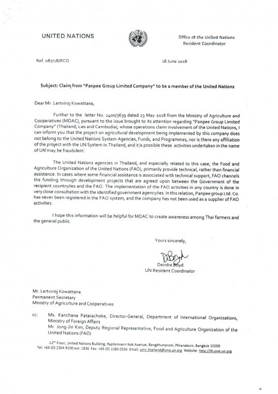 กระทรวงเกษตรและสหกรณ์ มีคำสั่งการให้จังหวัดเฝ้าระวังและตรวจสอบเรื่องมีบริษัทแอบอ้างเป็นสมาชิกองค์การสหประชาชาติ UN ซึ่งได้ชี้นำให้เกษตรกรเข้าร่วมโครงการพัฒนาการเกษตรแบบมีพันธสัญญา และมีเงินลงทุน โดยทางกระทรวงเกษตรและสหกรณ์ได้ประสานข้อมูลไปยังผู้สานงานสหประชาชาติประจำประเทศไทย (United Nations Resident Coordinator - UNRC) ให้ดำเนินการตรวจสอบข้อเท็จจริงเรืองการแอบอ้างดังกล่าว