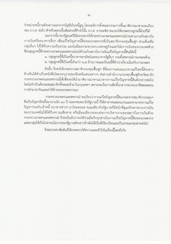 ขอความร่วมมือประชาสัมพันธ์ข้อเท็จจริงที่รัฐบาลโดยกระทรวงเกษตรและสหกรณ์ได้ร่วมกับธนาคารเพื่อการเกษตรและสหกรณ์การเกษตร แก้ไขปัญหาหนี้สินของเกษตรกรสมาชิกกองทุนฟื้นฟูและพัฒนาเกษตรกร