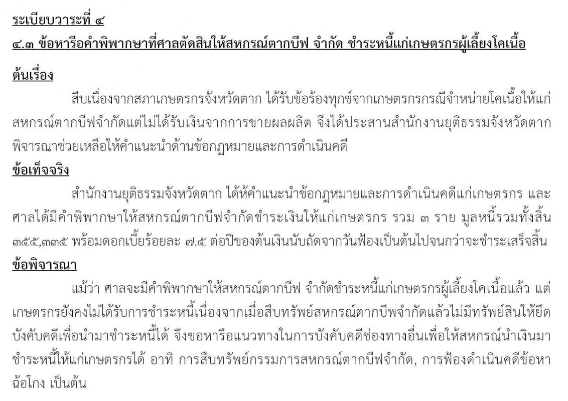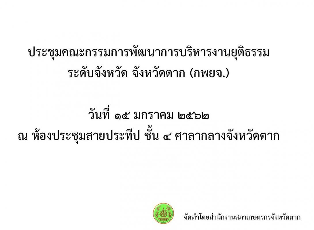 ประธานสภาเกษตรกรจังหวัดตาก (นางสาวโสภาพรรณ กาสมสัน) เข้าร่วมประชุมคณะกรรมการบริหารงานยุติธรรมระดับจังหวัด (กพยจ.) ครั้งที่ ๑/๒๕๖๒ เมื่อวันที ๑๕ มกราคม ๒๕๖๒ เวลา ๑๓.๐๐ น. ณ ห้องประชุมสายประทีป ชั้น ๔ ศาลากลางจังหวัดตาก โดยมีรองผู้ว่าราชการจังหวัดตาก (นายวรานนท์ ยิ้มมงคล) เป็นประธานที่ประชุมฯ ทั้งนี้ สภาเกษตรกรจังหวัดตากได้นำเรื่องแนวทางบังคับคดีให้สหกรณ์ตากบีฟจำกัดชำระหนี้ให้แก่เกษตรกร ตามคำพิพากษาศาล แลการขอคืนของกลาง (รถจักรยานยนต์) จากอุทยายแห่งชาติพะวอ ตามคำสั่งสำนักงานอัยการจังหวัดตากอำเภอแม่สอดคืนให้แก่เกษตรกร ในการประชุมฯ ดังกล่าว อนึ่ง ที่ประชุมฯ แจ้งว่ากรณีการบังคับคดีตามคำพิพากษาและติดตามทวงถามของกลางตามคำสั่งสำนักงานอัยการจังหวัดตากอำเภอแม่สอด นั้น ระดับจังหวัดไม่สามารถดำเนินการใดใดเพื่อช่วยเหลือเกษตรกรได้ อย่างไรก็ตาม สภาเกษตรกรจังหวัดตากได้มีหนังสือหารือแนวทางช่วยเหลือทั้ง ๒ กรณี ข้างต้น ไปยังอธิบดีกรมคุ้มครองสิทธิและเสรภาพ กระทรวงยุติธรรม เพื่อสร้างความเป็นธรรมให้แก่เกษตรกรด้วยแล้ว