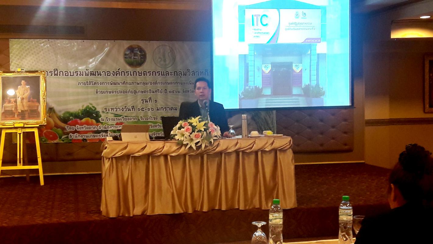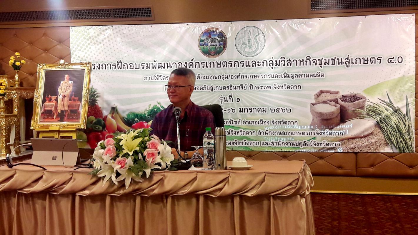 การฝึกอบรมเกษตรกรโครงการพัฒนาองค์กรเกษตรกรและกลุ่มวิสาหกิจชุมชนสู่เกษตร 4.0 บูรณาการดำเนินงานโครงการฯ โดยสำนักงานเกษตรและสหกรณ์จังหวัดตาก สำนักงานสภาเกษตรกรจังหวัดตาก และหน่วยงานที่เกี่ยวข้อง ซึ่งแบ่งการอบรมออกเป็น 2 รุ่น คือ รุ่นที่ 1 ระหว่างวันที 15-16 มกราคม 2562 ณ โรงแรมเวียงตากริเวอร์ไซด์ อำเภอเมืองตาก จังหวัดตาก และ รุ่นที่ 2 เตรียมพบกัน ระหว่างวันที่ 17-18 มกราคม 2562 ณ โรงแรมอิโค่อินน์ อำเภอแม่สอด จังหวัดตาก