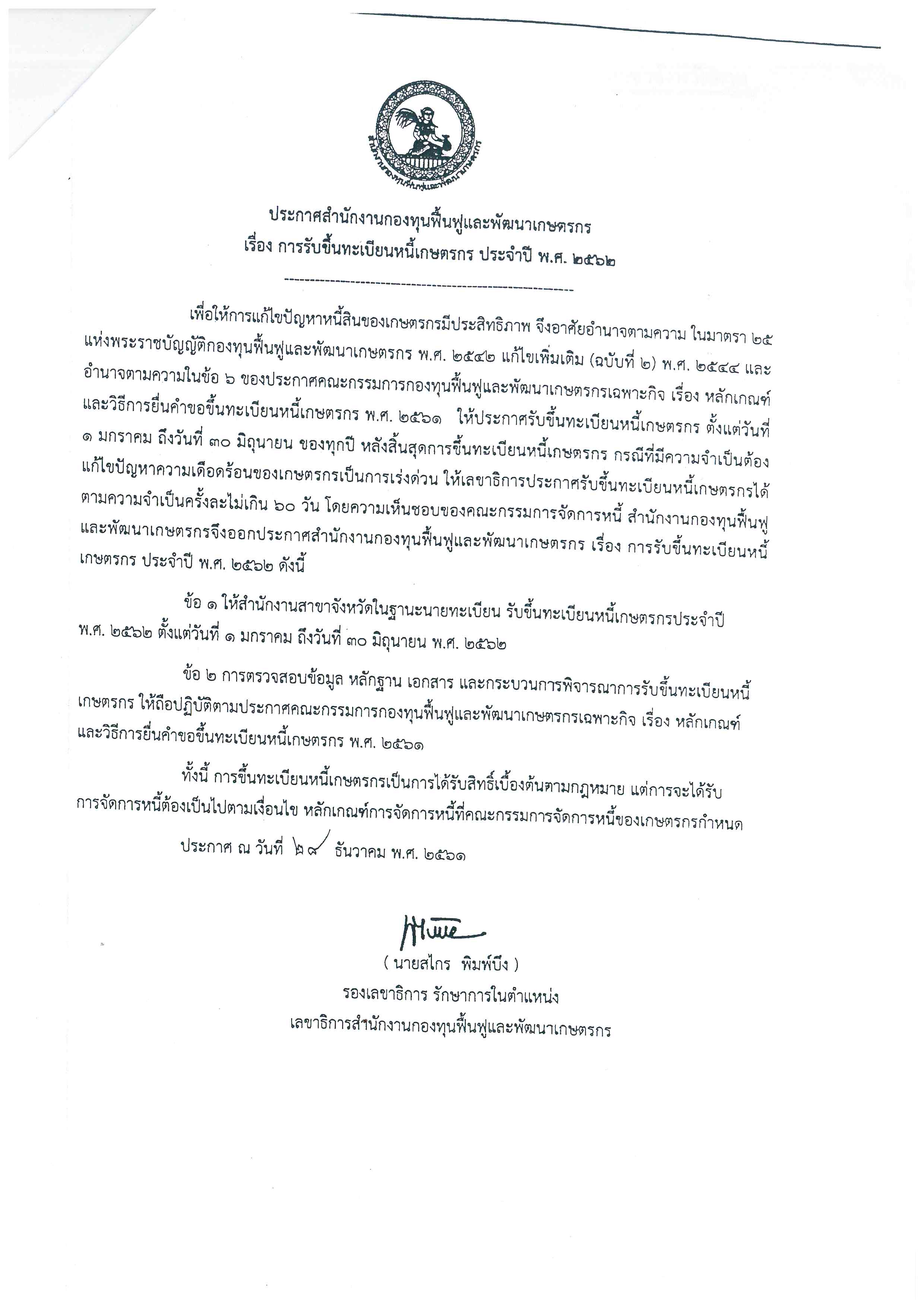 ประชาสัมพันธ์ : สำนักงานกองทุนฟื้นฟูและพัฒนาเกษตรกร สาขาจังหวัดตาก ประกาศรับขึ้นทะเบียนหนี้เกษตรกร ประจำปี พ.ศ. 2562