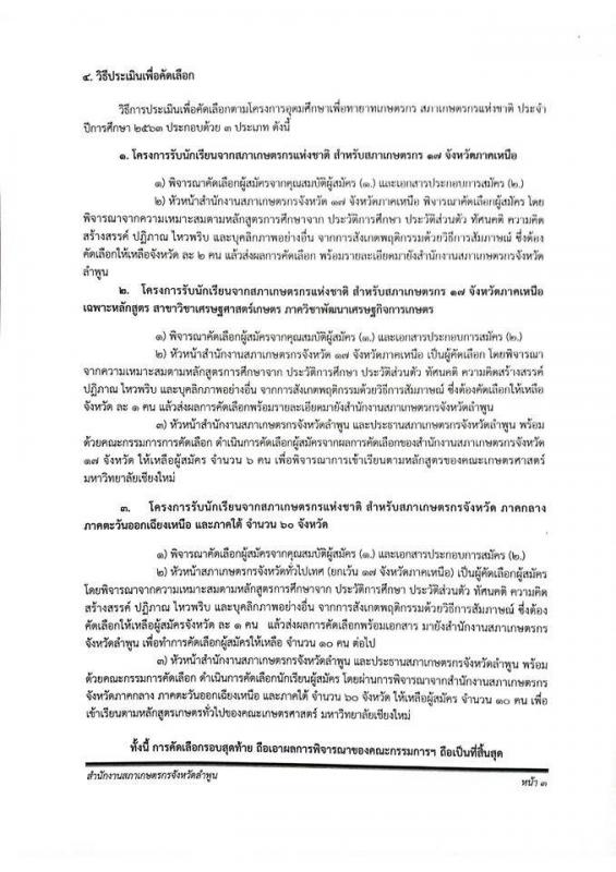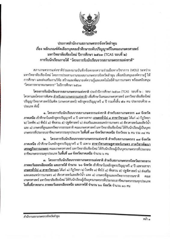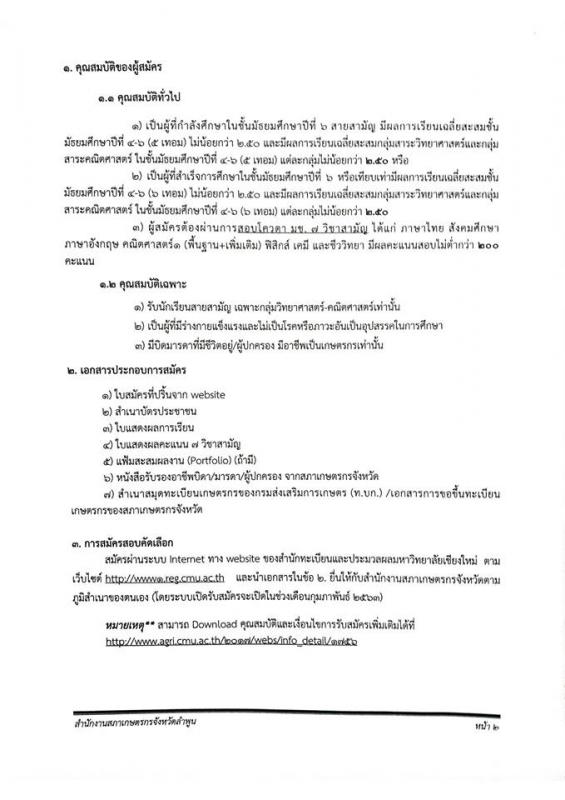 หลักเกณฑ์การรับนักเรียนทายาทเกษตรภายใต้ "โครงการรับนักเรียนจากสภาเกษตรกรแห่งชาติ" เพื่อศึกษาต่อในคณะเกษตรศาสตร์ มหาวิทยาลัยเชียงใหม่ หลักสูตร 4 ปี สำหรับนักเรียนที่มีภูมิลำเนาอยู่ใน ภาคกลาง ภาคตะวันออกเฉียงเหนือ และภาคใต้ ในสาขาเกษตรทั่วไป 8 สาขาวิชาเอก ได้แก่ กีฏวิทยา โรคพืช พืชไร่ พืชสวน ปฐพีศาสตร์ ส่งเสริมและเผยแพร่การเกษตร สัตวศาสตร์และสัตว์น้ำ และเกษตรที่สูงและทรัพยากรธรรมชาติ "จำนวน 10 คน"
