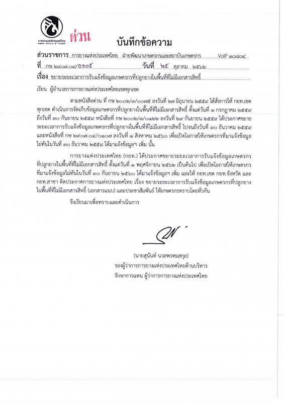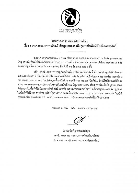 การยางแห่งประเทศไทย (กยท.) ประกาศขยายระยะเวลาการรับแจ้งข้อมูลเกษตรกรที่ปลูกยางในพื้นที่ที่ไม่มีเอกสารสิทธิ์ ตั้งแต่วันที่ 1 พฤศจิกายน 2562 เป็นต้นไป เพื่อเปิดโอกาสให้เกษตรกรที่มาแจ้งข้อมูลไม่ทันในวันที่ 30 กันยายน 2560 ได้มาแจ้งข้อมูลฯ เพิ่ม