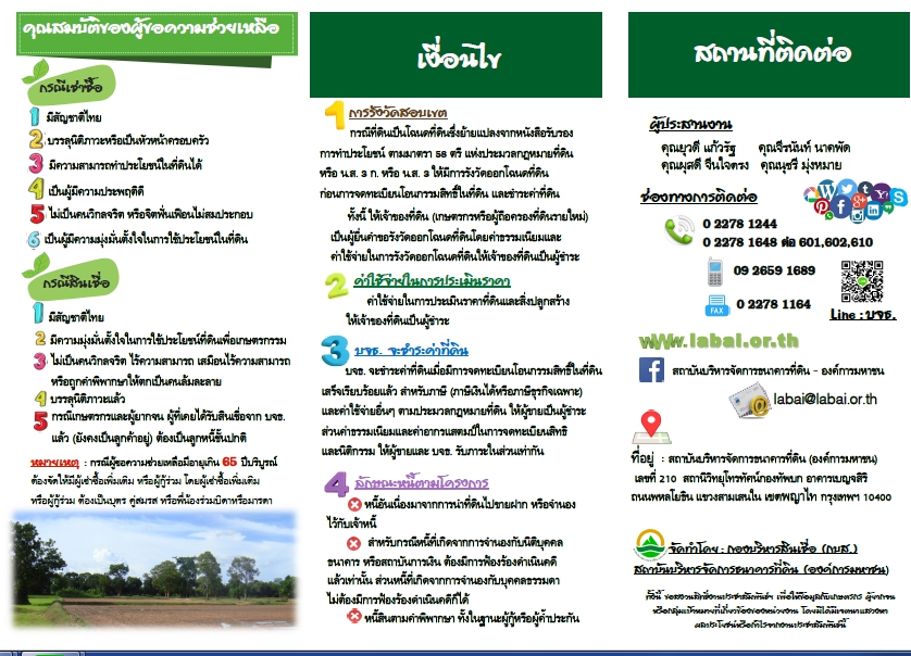สถาบันบริหารจัดการที่ดิน (องค์การมหาชน) ช่องทางแก้ไขการสูญเสียสิทธิในที่ดินของเกษตรกรและผู้ยากจน ประสงค์ขอรับความช่วยเหลือติดต่อได้ที่เบอร์โทรศัพท์ 02-278-1244 หรือ ติดต่อสอบถามข้อมูลเบื้องต้นได้ที่สำนักงานสภาเกษตรกรจังหวัดตาก 088-278-1280