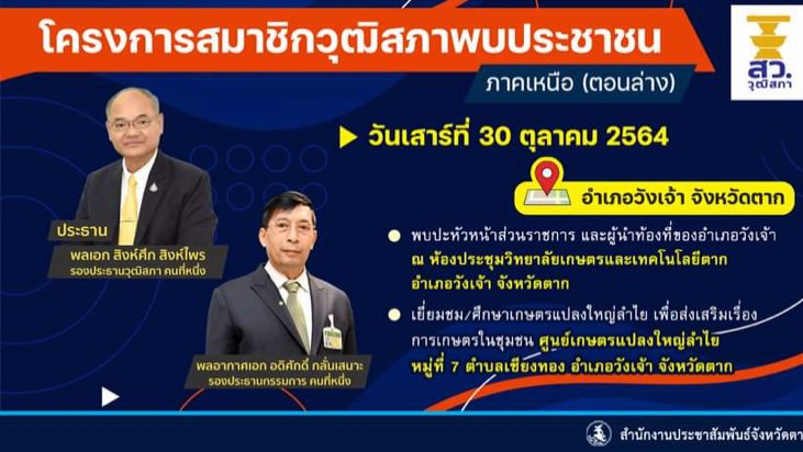 วันที่ 30 ตุลาคม 2564 นายสวัสดิ์ โนนสูง สมาชิกสภาเกษตรกรจังหวัดตาก ผู้ทรงคุณวุฒิด้านพืช (ประธานคณะทำงานด้านยุทธศาสตร์ฯ ) และนายพนม สินสอน สมาชิกสภาเกษตรกรฯ เป็นผู้แทนสภาเกษตรกรจังหวัดตาก เข้าร่วมแลกเปลี่ยนความเห็น พร้อมยื่นหนังสือนำเสนอประเด็นปัญหาและข้อเสนอเพื่อการพัฒนาการเกษตร ต่อสมาชิกวุฒิสภาในเวทีโครงการสมาชิวุกวุฒิสภาพบประชาชน ภาคเหนือตอนล่าง พื้นที่จังหวัดตาก ณ ห้องประชุมวิทยาลัยเกษตรและเทคโนโลยีตาก อำเภอวังเจ้า จังหวัดตาก