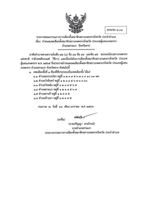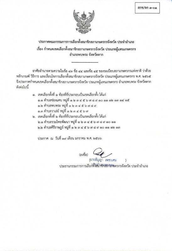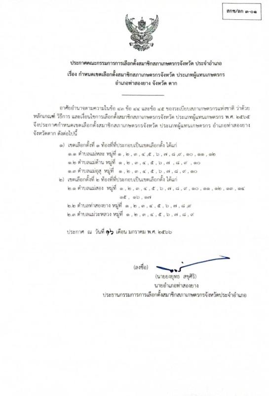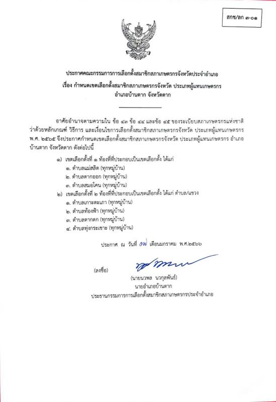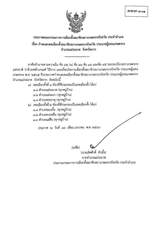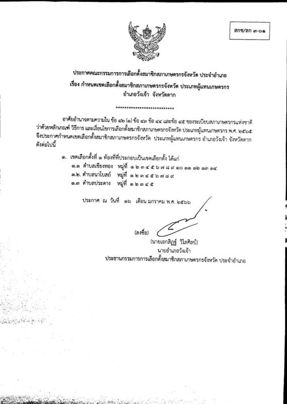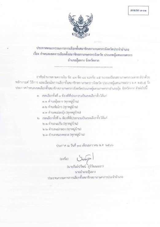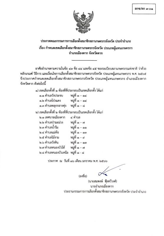 ประกาศกำหนดเขตเลือกตั้งสมาชิกสภาเกษตรกรจังหวัด ประเภทผู้แทนเกษตรกร พื้นที่จังหวัดตาก