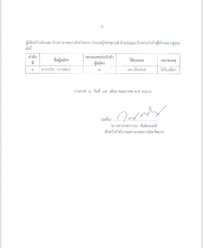 ประกาศสำนักงานสภาเกษตรกรจังหวัดตาก เรื่องผลการเลือกสมาชิกสภาเกษตรกรจังหวัด ประเภทผู้ทรงคุณวุฒิ จังหวัดตาก ประกาศ ณ วันที่ 15 พฤษภาคม 2566