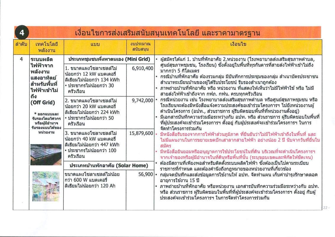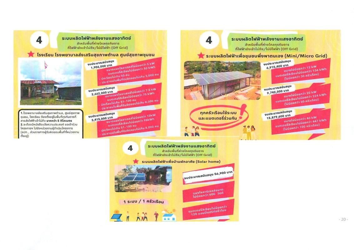 2.โครงการ “ไฟฟ้าชุมชน”โดยจะสนับสนุนการจัดสร้างสถานที่ผลิตไฟฟ้าด้วยพลังงานทดแทน เพื่อผลิตไฟฟ้าให้ชุมชน และหมู่บ้านในพื้นที่ห่างไกลและขาดแคลนไฟฟ้า