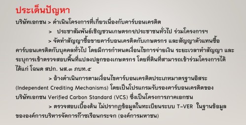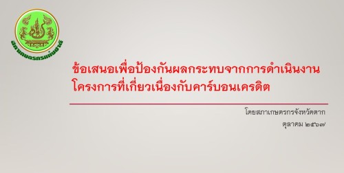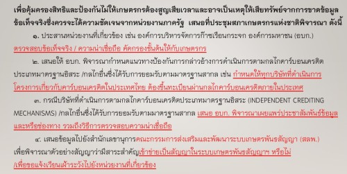 ทั้งนี้ ในการประชุมฯ ข้าง ประธานสภาเกษตรกรจังหวัดตาก ได้เสนอที่ประชุมพิจารณาแนวทางป้องกันผลกระทบจากการดำเนินงานโครงการที่เกี่ยวเนื่องกับคาร์บอนเครดิต เพื่อคุ้มครองสิทธิและป้องกันไม่ให้เกษตรกรต้องสูญเสียเวลาและอาจเป็นเหตุให้เสียทรัพย์จากการขาดข้อมูล