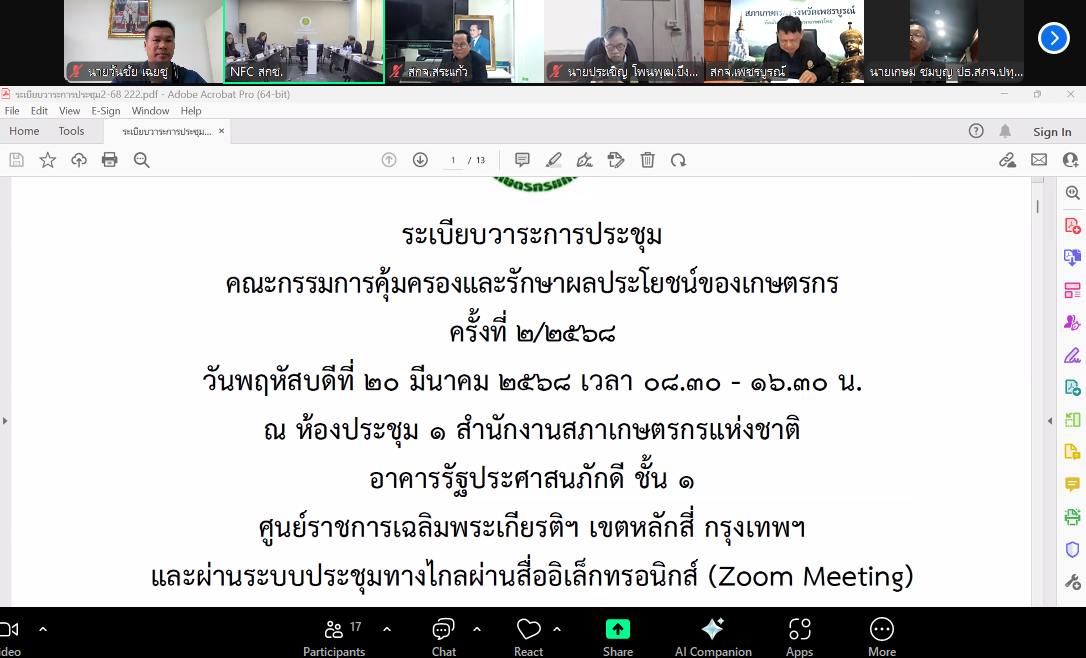 วันที่ 20 มีนาคม 2568 นายวันชัย เฉยชู ประธานสภาเกษตรกรจังหวัดตาก เข้าร่วมประชุมคณะกรรมการคุ้มครองและรักษาผลประโยชน์ของเกษตรกร ครั้งที่ 2/2568 ผ่านระบบประชุมทางไกลผ่านสื่ออิเล็กทรอนิกส์ (Zoom Meeting) เพื่อพิจารณาแผนการประชุมคณะอนุกรรมการการลดต้นทุนการบริหารจัดการการผลิตข้าวอย่างยั่งยืน พิจารณาข้อเสนอการแก้ไขปัญหาผลกระทบของเกษตรกรที่ประกอบอาชีพเกษตรกรจากการออกพระราชกฤษฎีกาว่าด้วยการกำหนดค่าใช้จ่าย แนวทางการช่วยเหลือเยียวยาชาวประมงกรณีเกิดภับพิบัติ
