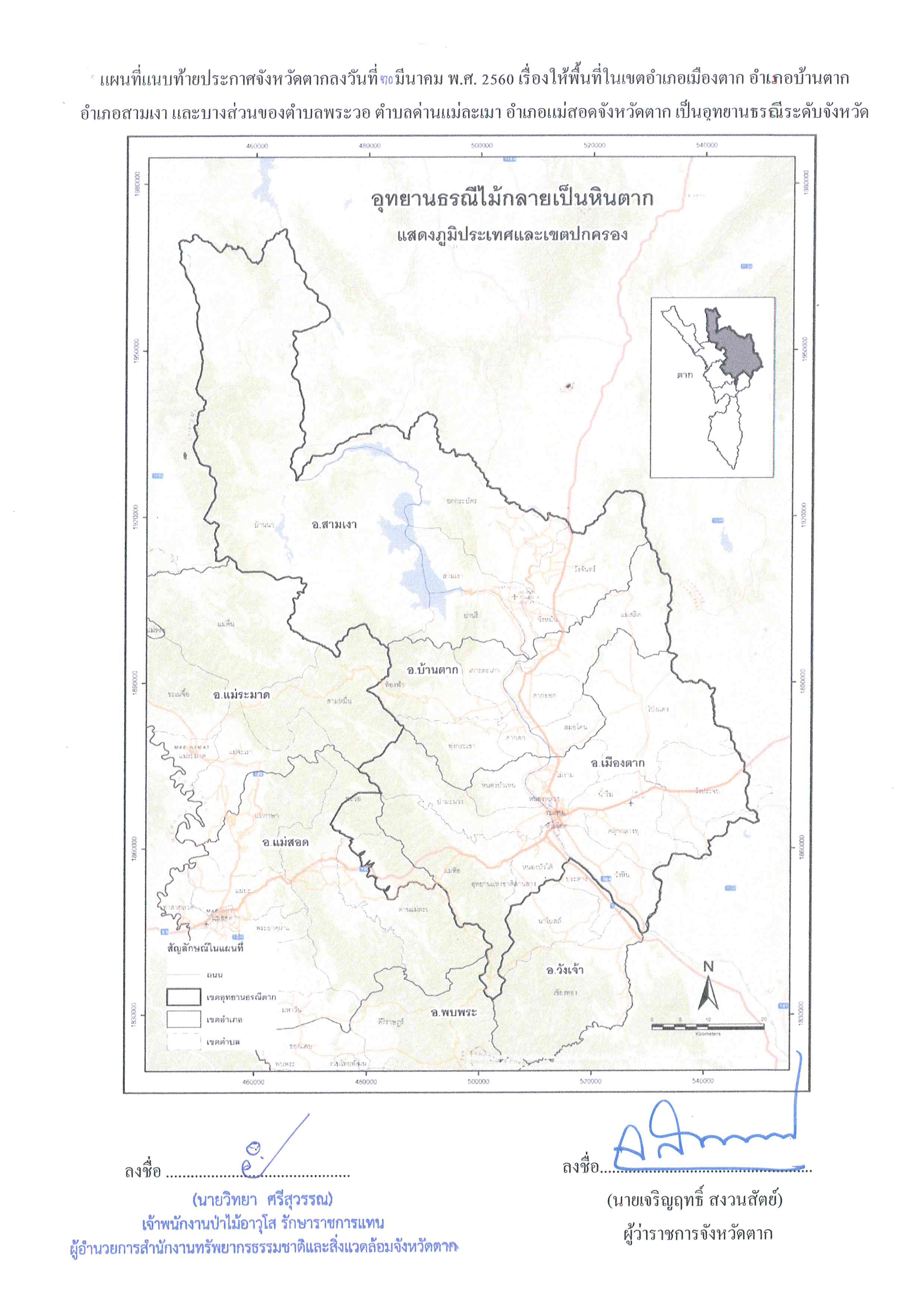 ประกาศจังหวัดตาก เรื่อง ให้พื้นที่ในเขตอำเภอเมืองตาก อำเภอบ้านตาก และอำเภอสามเงา และบางส่วนของตำบลพะวอ ตำบลด่านแม่ละเมา อำเภอแม่สอด จังหวัดตาก เป็นอุทยานธรณีระดับจังหวัดตาก ประกาศ ณ วันที่ 30 มีนาคม 2560