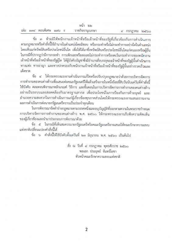 คำสั่งหัวหน้าคณะรักษาความสงบแห่งชาติ ที่ 33/2560 เรื่อง มาตรการชั่วคราวเพื่อแก้ไขข้อขัดข้องในการบริหารจัดการการทำงานของคนต่างด้าว สั่ง ณ วันที่ 4 กรกฎาคม 2560