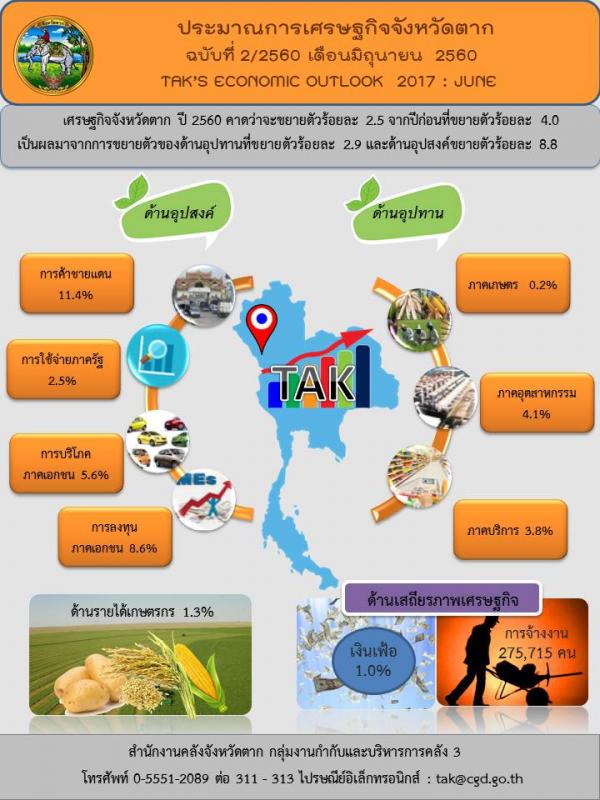 เผยแพร่รายงานภาวะเศรษฐกิจการคลังจังหวัดตาก ประจำเดือนพฤษภาคม 2560 และรายงานประมาณการเศรษฐกิจจังหวัดตาก ปี 2560 ณ เดือนมิถุนายน 2560 โดยสำนักงานคลังจังหวัดตาก