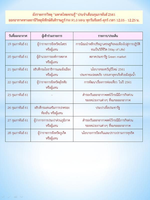 ประชาสัมพันธ์ ขอเชิญรับฟังรายการวิทยุ "มหาดไทยชวนรู้" ประจำเดือนกุมภาพันธ์ 2561