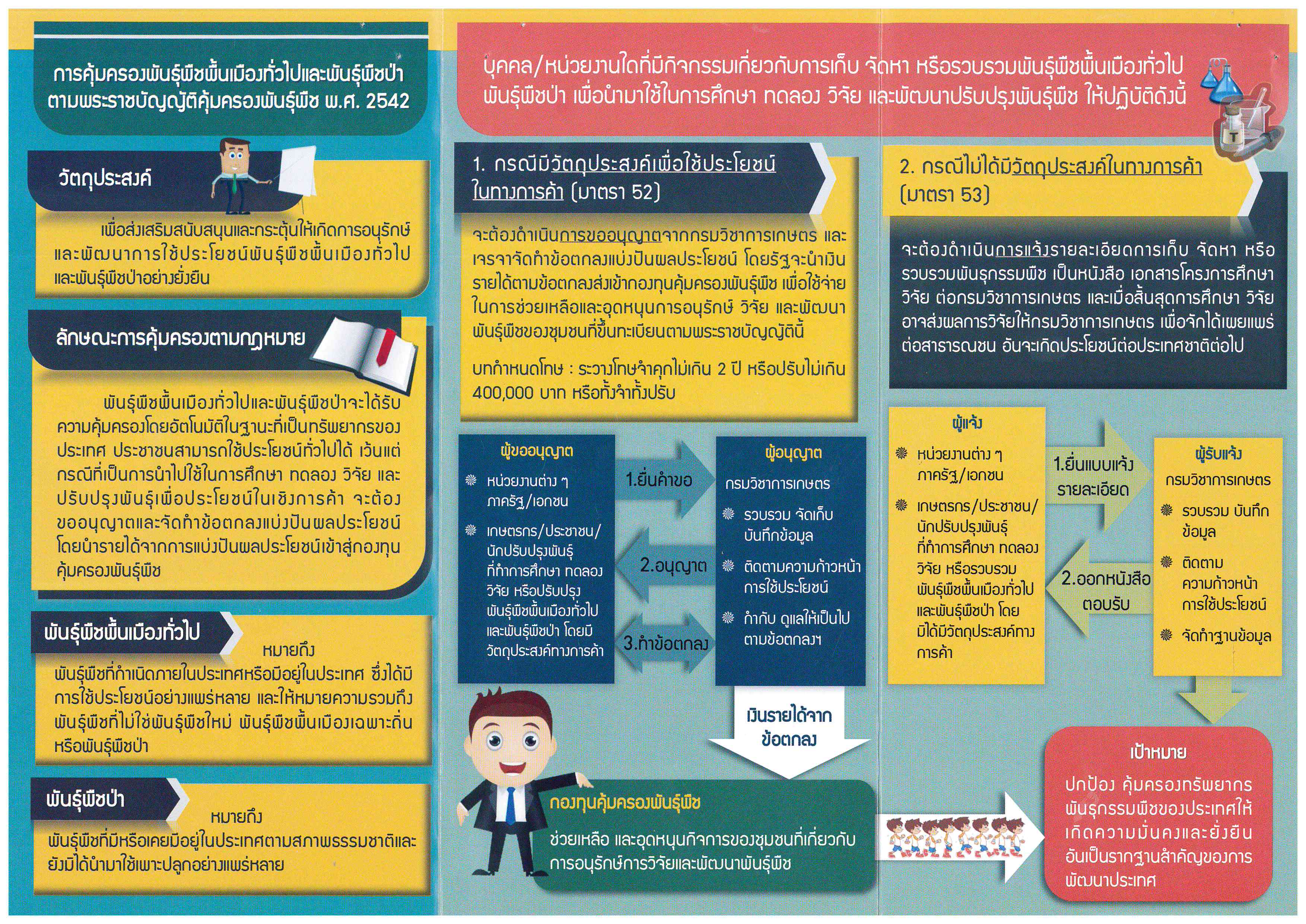 ระเบียบคณะกรรมการคุ้มครองพันธุ์พืชว่าด้วยการศึกษา ทดลอง หรือวิจัย พันธุ์พืชพื้นเมืองทั่วไปและพันธุ์พืชป่า ที่มิได้มีวัตถุประสงค์เพื่อประโยชน์ในทางการค้า พ.ศ.2547 จากกรมวิชาการ สำนักคุ้มครองพันธุ์พืช สำหรับนักวิจัย นักวิชาการ หรือผู้ทำการศึกษา ทดลอง วิจัย พันธุ์พืชพื้นเมืองทั่วไปและพันธุ์พืชป่า หรือส่วนหนึ่งส่วนใดของพันธุ์พืชดังกว่าว ที่มิได้มีวัตถุประสงค์เพื่อประโยชน์ทางการค้า ให้แจ้งเป็นหนังสือตามแบบฟอร์มที่กำหนดไว้ โดยสามารถดาวน์โหลดแบบฟอร์มการแจ้งได้ที่ http://www.doa.go.th/pvp/ หรือติดต่อกลุ่มวิจัยการคุ้มครองพันธุ์พืช สำนักคุ้มครองพันธุ์พืช โทร. 02-940-7214