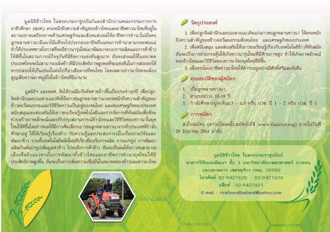 ขอเชิญเข้าร่วมโครงการอนุชนชาวนาไทย : ความอยู่รอดของข้าวไทย เข้าค่ายข้าวปี 2561