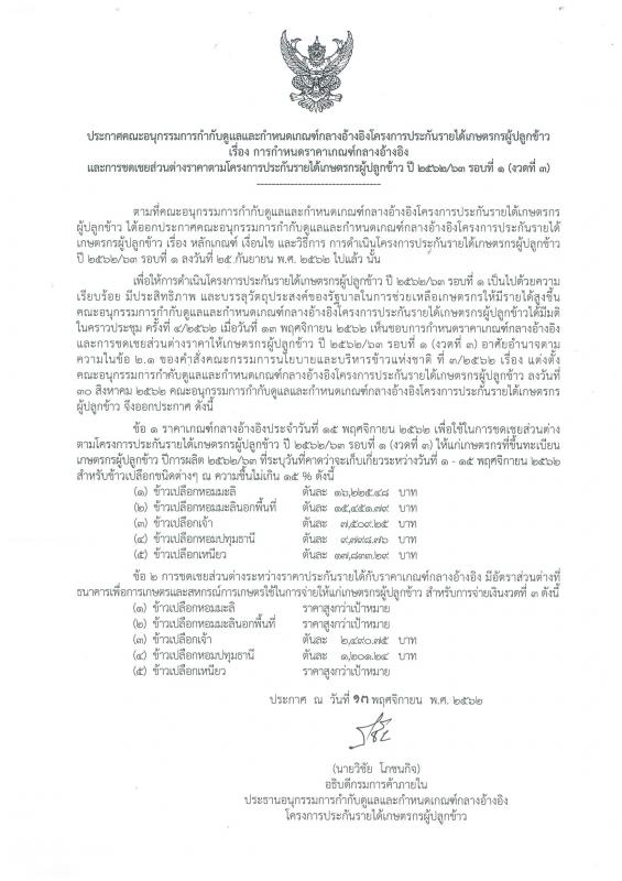 ประกาศคณะอนุกรรมการกำกับดูแลและกำหนดเกณฑ์กลางอ้างอิงโครงการประกันรายได้เกษตรกรผู้ปลูกข้าว เรื่องการกำหนดราคาเกณฑ์กลางอ้างอิงและการชดเชยส่วนต่างราคาตามโครงการประกันรายได้เกษตรกรผู้ปลูกข้าว ปี 2562/63 รอบที่ 1 (งวดที่ 2) และ (งวดที่ 3)