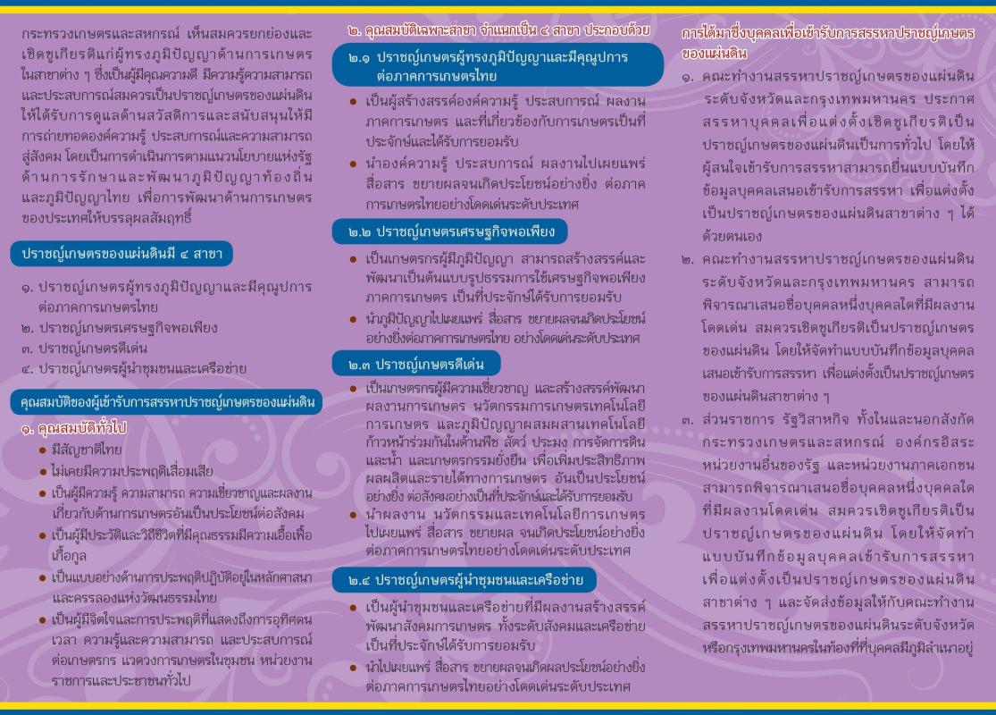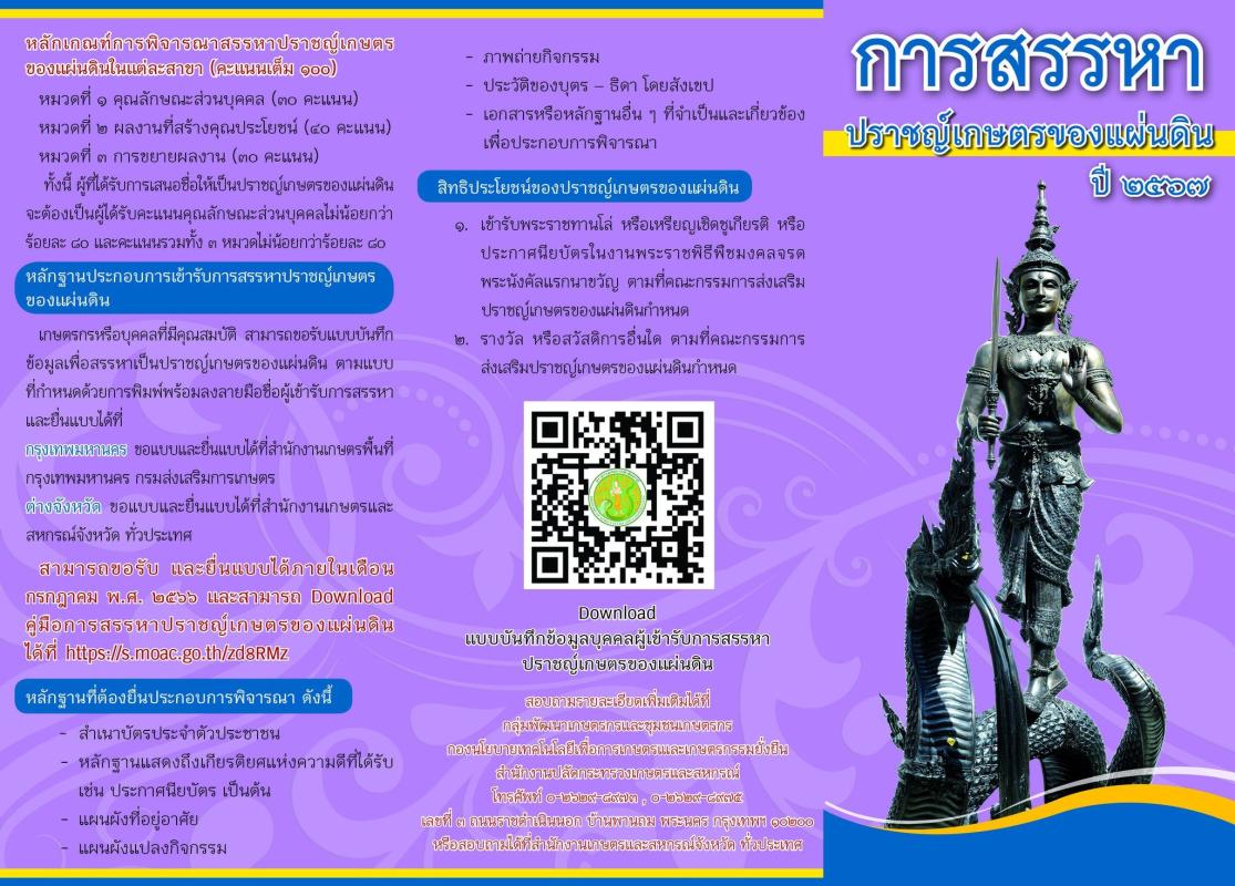 ประชาสัมพันธ์กระทรวงเกษตรและสหกรณ์ กำหนดให้มีการสรรหาปราชญ์เกษตรของแผ่นดิน ปี 2567 เพื่อยกย่องและเชิดชูเกียรติแก่ผู้ทรงภูมิปัญญาด้านการเกษตรในสาขาต่างๆ ซึ่งเป็นผู้มีคุณความดี มีความรู้ความสามารถ และประสบการณ์ สมควรเป็นปราชญ์เกษตรของแผ่นดิน ให้ได้รับการดูแลด้านสวัสดิการและสนับสนุนให้มีการถ่ายทอดองค์ความรู้ ประสบการณ์ และความสามารถสู่สังคม โดยสรรหาปราชญ์เกษตรของแผ่นดิน ใน 4 สาขา ได้แก่