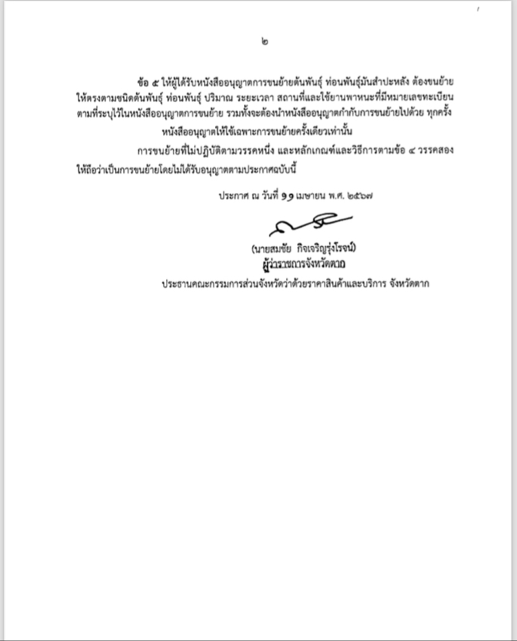 ประกาศจังหวัดตาก เรื่องการควบคุมการขนย้ายต้นพันธุ์ และท่อนพันธ์มันสำปะหลัง
