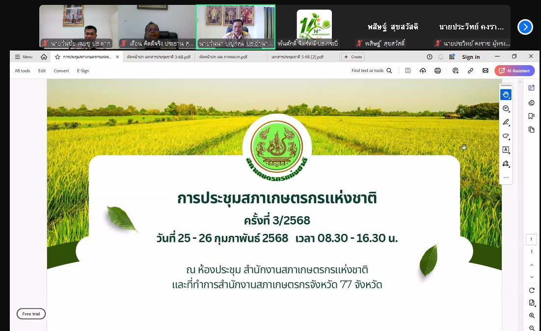วันที่ 25 - 26 ก.พ.68 เวลา 08.30 น. นายวันชัย เฉยชู ประธานสภาเกษตรกรจังหวัดตาก เข้าร่วมประชุมสภาเกษตรกรแห่งชาติ ครั้งที่ 3/2568 ผ่านระบบประชุมทางไกลผ่านสื่ออิเล็กทรอนิกส์ (Zoom Meeting) ถ่ายทอดสัญญาณจากอาคารรัฐประศาสนภักดี ชั้น 1 ศูนย์ราชการเฉลิมพระเกียรติฯ เขตหลักสี่ กรุงเทพฯ โดยมีนายนัยฤทธิ์ จำเล ประธานสภาเกษตรกรแห่งชาติ เป็นประธานในการประชุมฯ